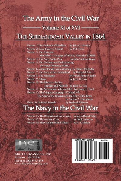This 16 Volume set was originally published in 1885 by Charles Scribners's & Sons. Written by 14 different authors such as Abner Doubleday, John Nicolay and Jacob D. Cox, these volumes present the Army and the Navy in the Civil war. The Army series covers causes and battles from the " Outbreak of Rebellion" to "Chancellorsville and Gettysburg" and on the "Virginia Campaign of '64 and '65. A volume of Statistical Records completes the Army set. The three volumes about the Navy include "The Blockade and the Cruisers", "The Atlantic Coast" and "The Gulf and Inland Waters". Each volume contains a wealth of information, with its own introduction, preface, index, appendix(s), illustrations and maps. As a set, it is in-depth view the Civil War.