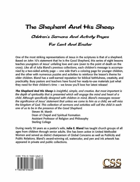 One of the most striking representations of Jesus in the scriptures is that of a shepherd. Based on John 10's statement that He is the Good Shepherd, this series of eight lessons teaches youngsters of Jesus' unfailing love and care (even to the point of death on the cross). Like all of her previous collections, each children's message is accompanied by a two-sided activity page -- one side that's a coloring page for younger children, and the other with numerous puzzles and activities to reinforce the lesson's theme for older children. Bland has a well-earned reputation for biblical faithfulness, creativity, and practicality. Busy pastors and teachers have found her ready-to-use materials just what they need for their children's time -- we know you'll love her latest release! The Shepherd And His Sheep is insightful, simple, and creative. But most important is the depth of spirituality that is presented which will engage the mind and heart of a child. Although specifically designed with children in mind, Bland's messages recover the significance of Jesus' statement that unless we come to him as a child, we will miss the kingdom of God. This collection of sermons and activities will call the child in each one of us to be in the presence of the Good Shepherd. Steven M. Marsh Dean of Chapel and Spiritual Formation Assistant Professor of Religion and Philosophy Sterling College During nearly 50 years as a pastor's wife, Julia Bland has taught church groups of all ages from children through senior adults. She has been active in United Methodist Women and served as district chairperson of Global Concerns as well as Publicity and Public Relations. Bland's award-winning oil, watercolor, and pen and ink artwork has appeared in private and public collections.