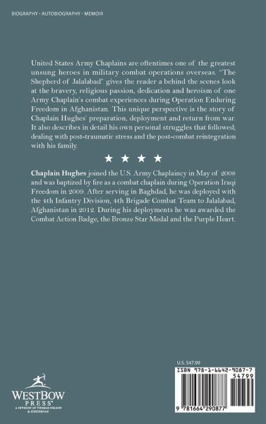 United States Army Chaplains are oftentimes one of the greatest unsung heroes in military combat operations overseas. "The Shepherd of Jalalabad" gives the reader a behind the scenes look at the bravery, religious passion, dedication and heroism of one Army Chaplain's combat experiences during Operation Enduring Freedom in Afghanistan. This unique perspective is the story of Chaplain Hughes' preparation, deployment and return from war. It also describes in detail his own personal struggles that followed; dealing with post-traumatic stress and the post-combat reintegration with his family.