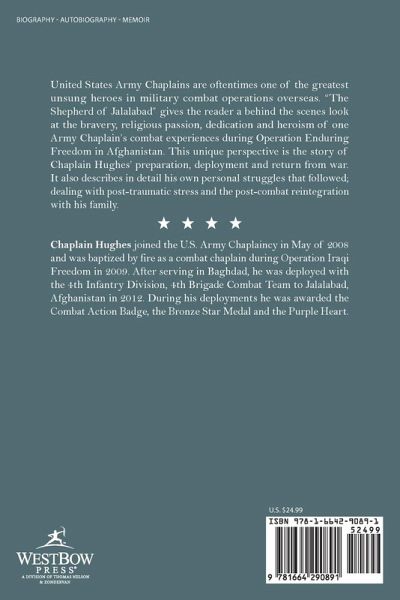 United States Army Chaplains are oftentimes one of the greatest unsung heroes in military combat operations overseas. "The Shepherd of Jalalabad" gives the reader a behind the scenes look at the bravery, religious passion, dedication and heroism of one Army Chaplain's combat experiences during Operation Enduring Freedom in Afghanistan. This unique perspective is the story of Chaplain Hughes' preparation, deployment and return from war. It also describes in detail his own personal struggles that followed; dealing with post-traumatic stress and the post-combat reintegration with his family.