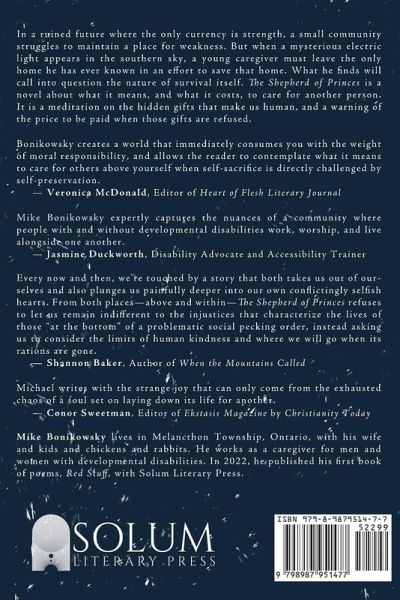 In a ruined future where the only currency is strength, a small community struggles to maintain a place for weakness. But when a mysterious electric light appears in the southern sky, a young caregiver must leave the only home he has ever known in an effort to save that home. What he finds will call into question the nature of survival itself. The Shepherd of Princes is a novel about what it means, and what it costs, to care for another person. It is a meditation on the gifts that those who seem to have nothing can offer their society, and of the price that is to be paid when those gifts are refused. It is a meditation on the hidden gifts that make us human, and a warning of the price to be paid when those gifts are refused.