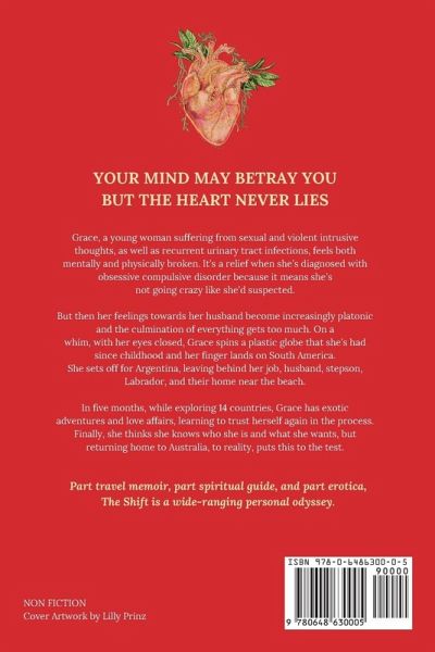 YOUR MIND MAY BETRAY YOU BUT THE HEART NEVER LIES Grace, a young woman suffering from sexual and violent intrusive thoughts, as well as recurrent urinary tract infections, feels both mentally and physically broken. It's a relief when she's diagnosed with obsessive compulsive disorder because it means she's not going crazy like she'd suspected. While working on managing her condition, her feelings towards her husband become increasingly platonic, and after battling with her head for so long, the culmination of everything gets too much. On a whim, with her eyes closed, Grace spins a plastic globe that she's had since childhood and her finger lands on South America. She sets off for Argentina, leaving behind her job, husband, stepson, Labrador, and their home near the beach. In five months, while exploring 14 countries, Grace has exotic adventures and love affairs, learning to trust herself again in the process. Finally, she thinks she knows who she is and what she wants, but returning home to Australia, to reality, puts this to the test. Part travel memoir, part spiritual guide, and part erotica, The Shift is a wide-ranging personal odyssey.