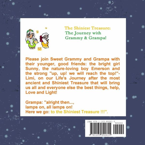 Please join Sweet Grammy and Grampa with their younger, good friends: the bright girl Sunny, the nature-loving boy Emerson and the strong "up, up! we will reach the top!"-Limi, on our Life's Journey after the most ancient and Shiniest Treasure that will bring us all and everyone else the best things, help, Love and Light! Grampa: "alright then..., lamps on, all lamps on! Here we go: to the Shiniest Treasure !!!".
