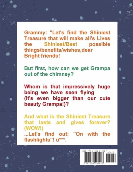 Grammy: "Let's find the Shiniest Treasure that will make all's Lives the Shiniest/Best possible things/benefits/wishes,dear Bright friends! But first, how can we get Grampa out of the chimney? Whom is that impressively huge being we have seen flying (it's even bigger than our cute beauty Grampa!)? And what is the Shiniest Treasure that lasts and gives forever? (WOW!) ...Let's find out: "On with the flashlights"! ü***.