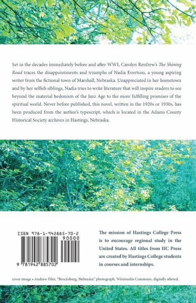 Set in the decades immediately before and after WWI, Carolyn Renfrew's The Shining Road traces the disappointments and triumphs of Nadia Evertson, a young aspiring writer from the fictional town of Marshall, Nebraska. Unappreciated in her hometown and by her selfish siblings, Nadia tries to write literature that will inspire readers to see beyond the material hedonism of the Jazz Age to the more fulfilling promises of the spiritual world. Never before published, this novel, written in the 1920s or 1930s, has been produced from the author's typescript, which is located in the Adams County Historical Society archives in Hastings, Nebraska.