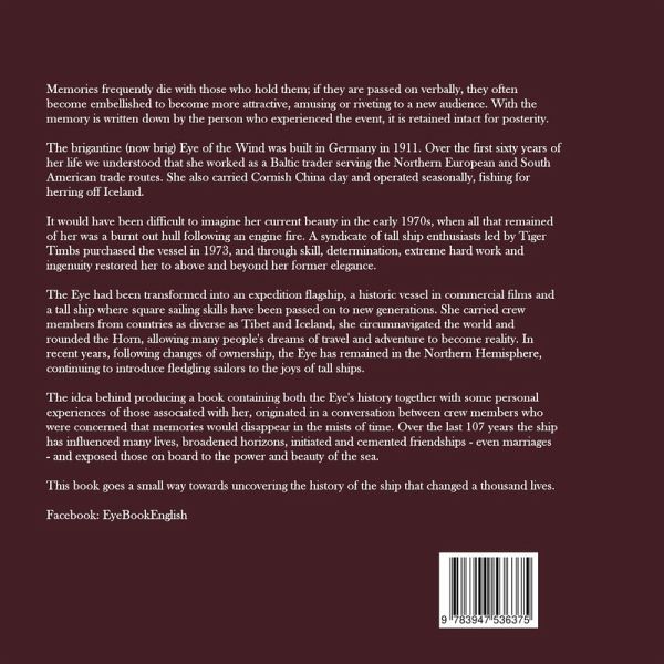 Memories frequently die with those who hold them; if they are passed on verbally, they often become embellished to become more attractive, amusing or riveting to a new audience. When the memory is written down by the person who experienced the event, it is retained intact for posterity. The brigantine (now brig) Eye of the Wind, was built in Germany in 1911. Over the first sixty years of her life she worked as a Baltic trader serving the Scandinavian, South American and Cornish routes and latterly, as a herring fishing boat. It would have been difficult to imagine her current beauty in the early 1970s, when all that remained of her was a burnt out hull following an engine fire. A syndicate of tall ship enthusiasts led by Tiger Timbs purchased the vessel in 1973, and through skill, determination, extreme hard work and ingenuity restored her to above and beyond her former elegance. The Eye had been transformed into an expedition flagship, a historic vessel in commercial films and a tall ship where square sail sailing skills have been passed on to new generations. She carried crew members from countries as diverse as Tibet and Iceland; she circumnavigated the world and rounded the Horn, allowing many people's dreams of travel and adventure to become a reality. In recent years, following changes in ownership, the Eye has remained in the Northern Hemisphere, continuing to introduce fledgling sailors to the joys of tall ships. The idea behind producing a book containing both the Eye's history together with some personal experiences of those associated with her, originated in a conversation between crew members who were concerned that memories would disappear in the mists of time. Over the last 107 years the ship has impacted on many lives, broadening horizons, initiating and cementing friendships - even marriages - and exposing those on board to the power and beauty of the sea. This book goes a small way towards uncovering the history of the ship that changed a thousand lives.