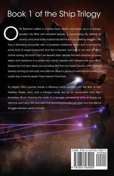 Otto Boteman suffers a massive heart attack and wakes up in a strange, jeweled city filled with beautiful people, a mesmer sky defying all physics, and what looks suspiciously like his first car. He has a disturbing encounter with a murdered childhood friend and an angel-like bureaucrat assures Otto that this is Heaven but God is not here so don't bother looking. No God? Can't be Heaven, then, despite the best cheese danishes Otto has ever eaten and a nice condo replete with HBO and tailored suits. Maybe he's not even dead, just comatose. But then he meets Claudia, a 5th Century beauty running an Irish pub, who tells him about a group of misfits building a rocket in the far desert. Their mission? Find God. So begins Otto's journey across a fabulous world peopled with the likes of Doc Holliday, Prester John, and a Mongol horde led by an accountant from West Kankakee, Illinois. Drawing the wrath of a frenzied, suit-wearing army of angels (or demons, can't tell) Otto discovers that launching the ship just might end the eternal struggle between good and evil.