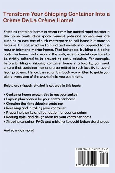 A Comprehensive Guide To Build An Environmentally Friendly Home With Shipping Containers Container homes are just what they sound like; homes built from container steel that transports goods on ships, trains, and trucks. From this container steel, homes of all shapes and sizes can be built. Shipping containers are used to construct homes, cabins, studios, and offices because with about 14 million 'out-of-service' containers worldwide, several of such containers are available for these purposes, not to mention the appeal that comes with experimenting with these giant blocks of containers. Aside from trendiness, building container homes have gained a wider interest amongst many because it saves money to construct. As such, several potential homeowners are seeking for homes with lesser construction and maintenance costs. Besides, the perception exists that container homes contribute to recycling initiatives. Containers come in different sizes, such as 10ft, 20ft, and 40ft, with the smallest shipping container providing a floor space of about 100 square feet for a shipping container home. Now imagine when hundreds of micro-apartments made of containers are constructed into a huge apartment building; the sight of such can be an astonishing grab for the eye. But you really don't need to rack up several containers before you can have a decent container home to live in. All you need is the right amount of knowledge and guidance to help you get the best out of your shipping container and have a well-put-together container you can call home. Hence, the reason this book was written. In this book, you will; Be familiar with the pros and cons of owning a shipping container home to help you make an informed decision. Have access to different container layout plans to help you get the most out of your container home. Know how to choose the right shipping container for your home using several deciding criteria. Be educated on how to prepare the site and foundation for your container properly. Know what container insulation entails and how it affects your container home. Know the different roofing styles applicable to container homes with directions on how to floor your container home. Be familiar with several design ideas you can implement to give your home an astonishing feel while conserving space. ...and so much more! Still having doubt this is your go-to guide to building a shipping container home? Get a copy of this book RIGHT NOW to find out.