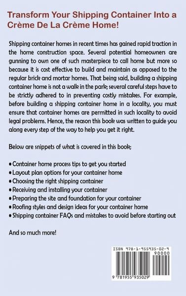 A Comprehensive Guide To Build An Environmentally Friendly Home With Shipping Containers Container homes are just what they sound like; homes built from container steel that transports goods on ships, trains, and trucks. From this container steel, homes of all shapes and sizes can be built. Shipping containers are used to construct homes, cabins, studios, and offices because with about 14 million 'out-of-service' containers worldwide, several of such containers are available for these purposes, not to mention the appeal that comes with experimenting with these giant blocks of containers. Aside from trendiness, building container homes have gained a wider interest amongst many because it saves money to construct. As such, several potential homeowners are seeking for homes with lesser construction and maintenance costs. Besides, the perception exists that container homes contribute to recycling initiatives. Containers come in different sizes, such as 10ft, 20ft, and 40ft, with the smallest shipping container providing a floor space of about 100 square feet for a shipping container home. Now imagine when hundreds of micro-apartments made of containers are constructed into a huge apartment building; the sight of such can be an astonishing grab for the eye. But you really don't need to rack up several containers before you can have a decent container home to live in. All you need is the right amount of knowledge and guidance to help you get the best out of your shipping container and have a well-put-together container you can call home. Hence, the reason this book was written. In this book, you will; Be familiar with the pros and cons of owning a shipping container home to help you make an informed decision. Have access to different container layout plans to help you get the most out of your container home. Know how to choose the right shipping container for your home using several deciding criteria. Be educated on how to prepare the site and foundation for your container properly. Know what container insulation entails and how it affects your container home. Know the different roofing styles applicable to container homes with directions on how to floor your container home. Be familiar with several design ideas you can implement to give your home an astonishing feel while conserving space. ...and so much more! Still having doubt this is your go-to guide to building a shipping container home? Get a copy of this book RIGHT NOW to find out.