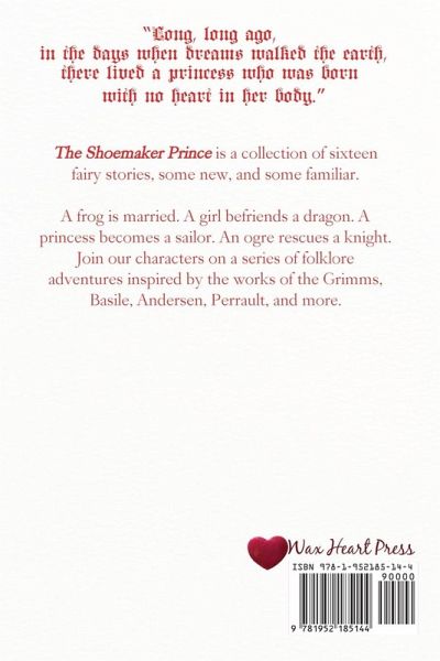 "Long, long ago, in the days when dreams walked the earth, there lived a princess who was born with no heart in her body." The Shoemaker Prince is a collection of sixteen fairy stories, some new, and some familiar. A frog is married. A girl befriends a dragon. A princess becomes a sailor. An ogre rescues a knight. Join our characters on a series of folklore adventures inspired by the works of the Grimms, Basile, Andersen, Perrault, and more.