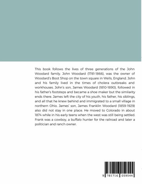 This book follows the lives of three generations of the John Woodard family. John Woodard (1781-1866), was the owner of Woodard's Boot Shop on the town square in Wells, England. His family lived in the times of cholera outbreaks and workhouses. John's son, James Woodard (1810-1890), followed in his father's footsteps and became a shoe maker but the similarity ends there. James left the city of his youth, his father, his siblings, and all that he knew behind and immigrated to a small village in northern Ohio. James' son, James Franklin Woodard (1859-1929) also did not stay in one place. He moved to Colorado in about 1874 while in his early teens when the west was still being settled. Frank was a cowboy, a buffalo hunter for the railroad and later a politician and ranch owner.
