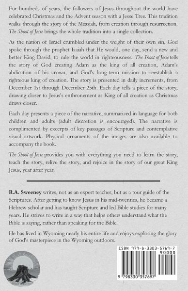 For hundreds of years, the followers of Jesus throughout the world have celebrated Christmas and the Advent season with a Jesse Tree. This tradition walks through the story of the Messiah, from creation through resurrection. The Shoot of Jesse brings the whole tradition into a single collection. As the nation of Israel crumbled under the weight of their own sin, God spoke through the prophet Isaiah that He would, one day, send a new and better King David, to rule the world in righteousness. The Shoot of Jesse tells the story of God creating Adam as the king of all creation, Adam's abdication of his crown, and God's long-term mission to reestablish a righteous king of creation. The story is presented in daily increments, from December 1st through December 25th. Each day tells a piece of the story, drawing closer to Jesus's enthronement as King of all creation as Christmas draws closer. Each day presents a piece of the narrative, summarized in language for both children and adults (adult discretion is encouraged). The narrative is complimented by excerpts of key passages of Scripture and contemplative visual artwork. Physical ornaments of the images are also available to accompany the book. The Shoot of Jesse provides you with everything you need to learn the story, teach the story, relive the story, and rejoice in the story of our great King Jesus, year after year. Accompanying ornaments can be purchased at DavekLelohimShop.etsy.com