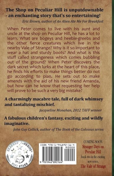 When Peter comes to live with his aunt and uncle at the shop on Peculiar Hill, he has a lot to learn. What are bogeys and heeble-greebs and the other fierce creatures which live in the nearby Vale of Strange? Why is it so important to wear a hat and sturdy boots? And what is this stuff called strangeness which comes bubbling out of the ground? When Peter discovers the dark secret which lurks at the heart of this place, he finds his efforts to make things better do not go according to plan. He sets out to make amends with the aid of his new friend Amanda, but how can he know that requesting her help will prove to be such a very big mistake?