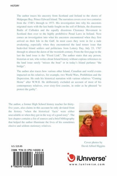 The author traces his ancestry from Scotland and Ireland to the shores of Malpeque Bay, Prince Edward Island. The narration covers over two centuries from the 1740's through to 1973. His investigation into why his ancestors migrated starts with the last battle fought on the soil of Britain, the disastrous Battle of Culloden and the equally disastrous Clearance Movement in Scotland then over to the highly prohibitive Penal Laws in Ireland. Next comes an investigation into what his ancestors encountered when they first arrived on their Isle in the Gulf. In most cases they were in for a rude awakening, especially when they encountered the land tenure issue that bedeviled Island settlers and politicians from Lottery Day, July 23, 1767 through to almost the dawn of the twentieth century. From the first page to the last the land issue is the "Fixed Link". The author states that any person, historian or not, who writes about Island history without copious references to the land issue surely "misses the boat" or in today's Island parlance "the bridge". The author also traces how various other Island, Canadian and world events impacted on his relatives, for example, two World Wars, Prohibition and the Depression. He ends his historical narration with various relatives "Coming Home" after W.W.II. He deliberately excluded an account of most of his contemporary relatives, over sixty-first cousins, in order as he phrased "to protect the guilty".