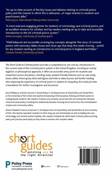 The Short Guide to Criminal Justice provides a comprehensive, yet concise, introduction to the criminal justice system in the United Kingdom. It includes many student-friendly features such as case study boxes, tables showing key facts and figures and links to data sources and further reading.
