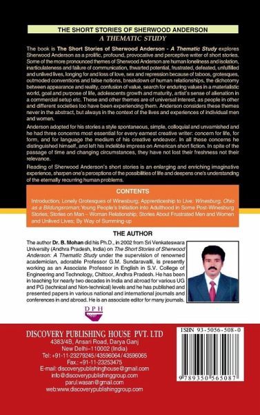 The book is The Short Stories of Sherwood Anderson - A Thematic Study explores Sherwood Anderson as a prolific, profound, provocative and perceptive writer of short stories. Some of the more pronounced themes of Sherwood Anderson are human loneliness and isolation, inarticulateness and failure of communication, thwarted potential, frustrated, defeated, unfulfilled and unlived lives, longing for and loss of love, sex and repression because of taboos, grotesques, outmoded conventions and false notions, breakdown of human relationships, the dichotomy between appearance and reality, confusion of value, search for enduring values in a materialistic world, goal and purpose of life, adolescents growth and maturity, artist's sense of alienation in a commercial setup etc.