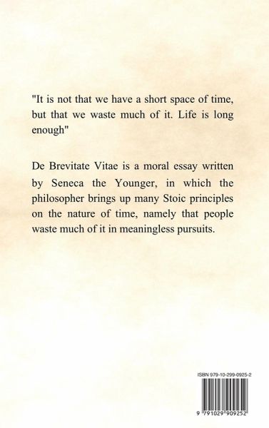 "It is not that we have a short space of time, but that we waste much of it. Life is long enough" De Brevitate Vitae is a moral essay written by Seneca the Younger, in which the philosopher brings up many Stoic principles on the nature of time, namely that people waste much of it in meaningless pursuits.