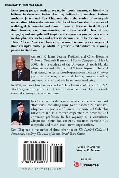 Every young person needs a role model, coach, mentor or friend who believes in them and insists that they believe in themselves. Authors Anthony James and Ken Chapman share the stories of twenty-eight outstanding African-Americans who faced head on the challenges of realizing their potential and chose to make a difference in the lives of their families, their communities, and their world. Their stories, struggles, and strengths will inspire and empower a younger generation to discipline themselves and act with decisiveness to better our world. These African-American leaders often acted in unexpected ways and their examples challenge adults to provide a "shoulder" for a young to stand on.