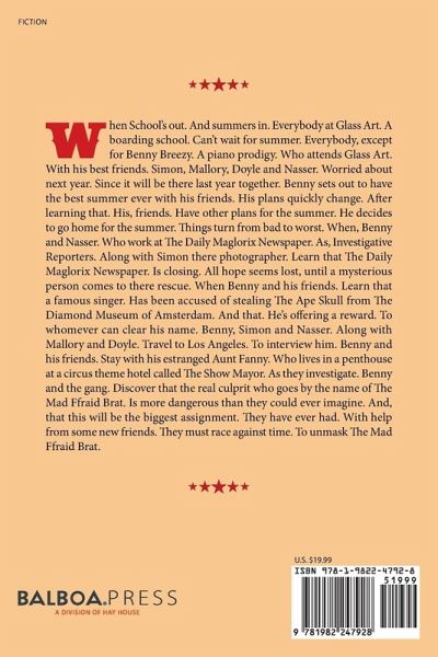 When School's out. And summers in. Everybody at Glass Art. a elite boarding school. Can't wait for summer. Everybody, except for Benny Breezy. A piano prodigy. Who attends Glass Art. With his best friends. Simon, Mallory, Doyle and Nasser. Worried about next year. Since it will be there last year together. Benny sets out to have the best summer ever with his friends. His plans quickly change. After learning that. His, friends. Have other plans for the summer. He decides to go home for the summer. Things turn from bad to worst. When, Benny and Nasser. Who work at The Daily Maglorix Newspaper. As, Investigative Reporters. Along with Simon there photographer. Learn that The Daily Maglorix Newspaper. Is closing. All hope seems lost, until a mysterious person comes to there rescue. When Benny and his friends. Learn that a famous singer. Has been accused of stealing The Ape Skull from The Diamond Museum of Amsterdam. And that. He's offering a reward. To whomever can clear his name. Benny, Simon and Nasser. Along with Mallory and Doyle. Travel to Los Angeles. To interview him. While there in Los Angeles. Benny and his friends. Stay with his estranged Aunt Fanny. Who lives in a penthouse at a circus theme hotel called The Show Mayor. As they investigate. Benny and the gang. Discover that the real culprit who goes by the name of The Mad Ffraid Brat. Is more dangerous than they could ever imagine. And, that this will be the biggest assignment. They have ever had. With help from some new friends. They must race against time. To unmasked The Mad Ffraid Brat.