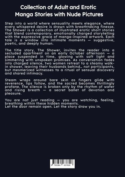 Step into a world where sensuality meets elegance, where every whispered desire is drawn with breathtaking finesse. The Shower is a collection of illustrated erotic short stories that blend contemporary, emotionally charged storytelling with the expressive grace of manga-inspired artwork. Each tale is a window into intimate moments - suggestive, poetic, and deeply human.The title story, The Shower, invites the reader into a secluded apartment on an early October afternoon - a place suspended in time, glowing with soft light and simmering with unspoken promises. As conversation fades into charged silence, two women retreat to a steamy walk-in shower, leaving their husbands behind... not participants, but mesmerized witnesses to a ritual of sensual discovery and shared intimacy.Steam wraps around bare skin as fingers glide with reverence, lips follow, and the sacred becomes thrillingly profane. The silence is broken only by the rhythm of water and rising breath - a secret ballet ofdevotion and pleasure.You are not just reading - you are watching, feeling, breathing within these hidden moments.Let the door remain open. Let the story draw you in.
