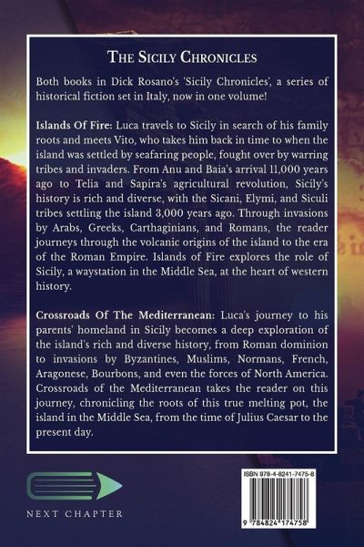 Both books in Dick Rosano's 'Sicily Chronicles', a series of historical fiction set in Italy, now in one volume! Islands Of Fire: Luca travels to Sicily in search of his family roots and meets Vito, who takes him back in time to when the island was settled by seafaring people, fought over by warring tribes and invaders. From Anu and Baia's arrival 11,000 years ago to Telia and Sapira's agricultural revolution, Sicily's history is rich and diverse, with the Sicani, Elymi, and Siculi tribes settling the island 3,000 years ago. Through invasions by Arabs, Greeks, Carthaginians, and Romans, the reader journeys through the volcanic origins of the island to the era of the Roman Empire. Islands of Fire explores the role of Sicily, a waystation in the Middle Sea, at the heart of western history. Crossroads Of The Mediterranean: Luca's journey to his parents' homeland in Sicily becomes a deep exploration of the island's rich and diverse history, from Roman dominion to invasions by Byzantines, Muslims, Normans, French, Aragonese, Bourbons, and even the forces of North America. Crossroads of the Mediterranean takes the reader on this journey, chronicling the roots of this true melting pot, the island in the Middle Sea, from the time of Julius Caesar to the present day.