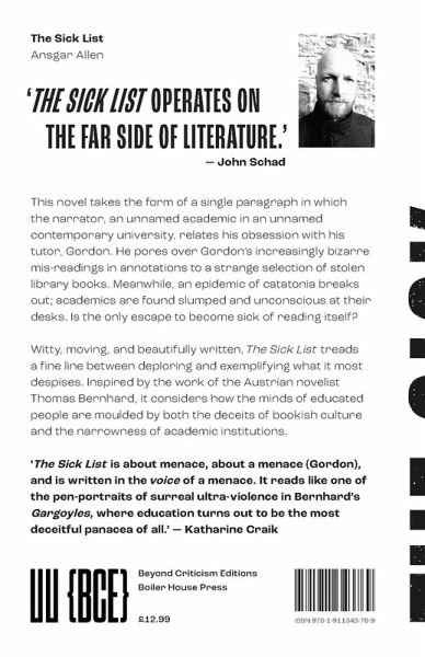 'The Sick List operates on the far side of literature.' John Schad In this novel, an unnamed academic in an unnamed contemporary university, relates his obsession with his tutor, Gordon. He pores over the increasingly bizarre mis-readings in Gordon's annotations in a strange selection of stolen library books. Is Gordon unraveling a mystery? Or is his own mind unraveling? Meanwhile, an epidemic of catatonia breaks out; academics are found slumped and unconscious at their desks. Is reading itself the cause of this sickness? Is the only escape to return to illiteracy? Witty, moving, and beautifully written, The Sick List plays with the dividing line between deploring and exemplifying what it most despises. Inspired by the work of the Austrian novelist Thomas Bernhard, it considers how the minds of educated people are moulded by both the breadth of literary culture and the narrowness of academic institutions. 'The Sick List is about menace, about a menace (Gordon), and is written in the voice of a menace. It reads like one of the pen-portraits of surreal ultra-violence in Bernhard's Gargoyles, where education turns out to be the most deceitful panacea of all.' Katharine Craik