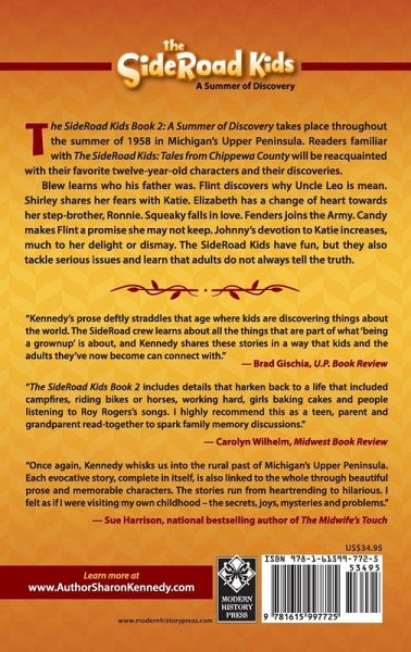 The SideRoad Kids Book 2: A Summer of Discovery takes place throughout the summer of 1958 in Michigan's Upper Peninsula. Readers familiar with The SideRoad Kids: Tales from Chippewa County will be reacquainted with their favorite twelve-year-old characters and their discoveries. Blew learns who his father was. Flint discovers why Uncle Leo is mean. Shirley shares her fears with Katie. Elizabeth has a change of heart towards her step-brother, Ronnie. Squeaky falls in love. Fenders joins the Army. Candy makes Flint a promise she may not keep. Johnny's devotion to Katie increases, much to her delight or dismay. The SideRoad Kids have fun, but they also tackle serious issues and learn that adults do not always tell the truth. "Kennedy's prose deftly straddles that age where kids are discovering things about the world. The SideRoad crew learns about all the things that are part of what 'being a grownup' is about, and Kennedy shares these stories in a way that kids and the adults they've now become can connect with." --Brad Gischia, U.P. Book Review "The SideRoad Kids Book 2 is an engaging read that includes details that harken back to a life that included campfires, riding bikes or horses, working hard, girls baking cakes and people listening to Roy Rogers's songs. I highly recommend this as a teen, parent and grandparent read-together to spark family memory discussions." --Carolyn Wilhelm, Midwest Book Review" Once again, Kennedy whisks us into the rural past of Michigan's Upper Peninsula. Each evocative story, complete in itself, is also linked to the whole through beautiful prose and memorable characters. The stories run from heartrending to hilarious. I felt as if I were visiting my own childhood - the secrets, joys, mysteries and problems." --Sue Harrison, national bestselling author of The Midwife's Touch Learn more at AuthorSharonKennedy.com From Modern History Press