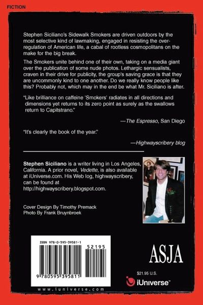 Stephen Siciliano's Sidewalk Smokers are a mélange of semi-employed rakes and rakettes occupying the ranks of a maligned subculture. Driven outdoors by the most selective kind of lawmaking, they find their resistance to the increased regulation of American life symptomatic of a deeper sense of threatened homogenization. What's different about The Sidewalk Smokers Club's battle for individual sanctity is how it is carried on within the confines of a collective effort. Lethargic sensualists, craven in their drive for publicity, the group's saving grace is that they are uncommonly kind to one another. Do we really know people like this? Probably not, which may, in the end, be what Mr. Siciliano is after. At best unconsecrated makers of useless things, at worst a cabal of rootless cosmopolitans on the make for the big break, The Smokers are united behind one of their own, taking on a media giant over the publishing of some dated, nude photos. Aware that outlandish behavior garners notoriety they climb into the public eye, opening their tendencies to the approbation or vilification by a society of "watchers". They get both. A journalist of 20-plus years, Mr. Siciliano impishly details the consensus corruption that greases America's political machine, A prolific screenwriter, his conversations crackle with the Noel Coward-like insight, sophistication and humor one might expect from a group of neo-bohemians sitting around breathing each other's insalubrious emissions.