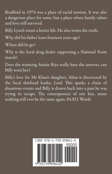 Bradford in 1974 was a place of racial tension. It was also a dangerous place for some, but a place where family values and love still survived. Billy Lynch wants a better life. He also wants the truth. Why did his father leave fourteen years ago? Where did he go? Why is the local drug dealer supporting a National Front march? Does the stunning Auntie Riya really have the answers, can Billy trust her? Billy's love for Mr Khan's daughter, Alina is discovered by the local skinhead leader, Lard. This sparks a chain of disastrous events and Billy is drawn back into a past he was trying to escape. The consequences of one kiss, mean nothing will ever be the same again. 84,921 Words