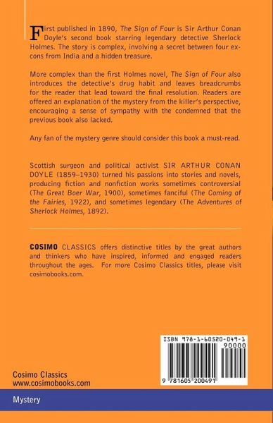 First published in 1890, The Sign of Four is Sir Arthur Conan Doyle's second book starring legendary detective Sherlock Holmes. The story is complex, involving a secret between four ex-cons from India and a hidden treasure. More complex than the first Holmes novel, The Sign of Four also introduces the detective's drug habit and leaves breadcrumbs for the reader that lead toward the final resolution. Readers are offered an explanation of the mystery from the killer's perspective, encouraging a sense of sympathy with the condemned that the previous book also lacked. Any fan of the mystery genre should consider this book a must-read. Scottish surgeon and political activist SIR ARTHUR CONAN DOYLE (1859-1930) turned his passions into stories and novels, producing fiction and nonfiction works sometimes controversial (The Great Boer War, 1900), sometimes fanciful (The Coming of the Fairies, 1922), and sometimes legendary (The Adventures of Sherlock Holmes, 1892).