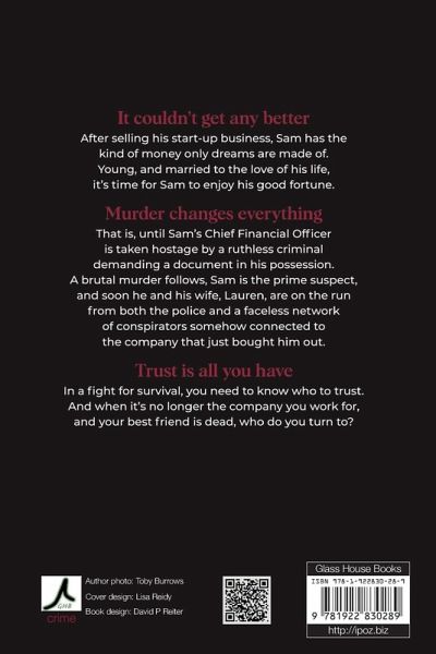 After selling his start-up business, Sam has the kind of money only dreams are made of. Young, and married to the love of his life, it's time for Sam to enjoy his good fortune. That is, until Sam's Chief Financial Officer is taken hostage by a ruthless criminal demanding a document in his possession. A brutal murder follows, Sam is the prime suspect, and soon he and his wife, Lauren, are on the run from both the police and a faceless network of conspirators somehow connected to the company that just bought them out. In a fight for survival, you need to know who to trust. And when it's no longer the company you work for, and your best friend is dead, who do you turn to?