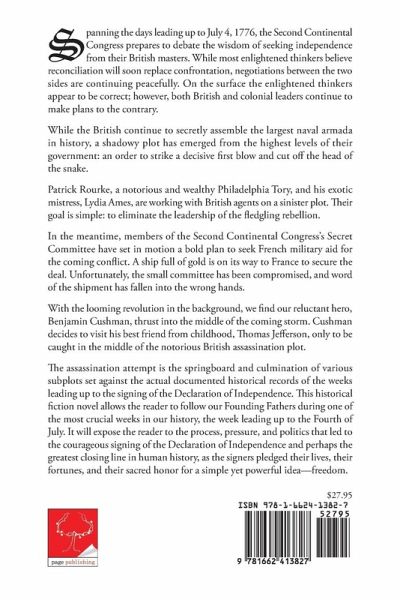 Spanning the days leading up to July 4, 1776, the Second Continental Congress prepares to debate the wisdom of seeking independence from their British masters. While most enlightened thinkers believe reconciliation will soon replace confrontation, negotiations between the two sides are continuing peacefully. On the surface the enlightened thinkers appear to be correct; however, both British and colonial leaders continue to make plans to the contrary. While the British continue to secretly assemble the largest naval armada in history, a shadowy plot has emerged from the highest levels of their government: an order to strike a decisive first blow and cut off the head of the snake. Patrick Rourke, a notorious and wealthy Philadelphia Tory, and his exotic mistress, Lydia Ames, are working with British agents on a sinister plot. Their goal is simple: to eliminate the leadership of the fledgling rebellion. In the meantime, members of the Second Continental Congress's Secret Committee have set in motion a bold plan to seek French military aid for the coming conflict. A ship full of gold is on its way to France to secure the deal. Unfortunately, the small committee has been compromised, and word of the shipment has fallen into the wrong hands. With the looming revolution in the background, we find our reluctant hero, Benjamin Cushman, thrust into the middle of the coming storm. Cushman decides to visit his best friend from childhood, Thomas Jefferson, only to be caught in the middle of the notorious British assassination plot. The assassination attempt is the springboard and culmination of various subplots set against the actual documented historical records of the weeks leading up to the signing of the Declaration of Independence. This historical fiction novel allows the reader to follow our Founding Fathers during one of the most crucial weeks in our history, the week leading up to the Fourth of July. It will expose the reader to the process, pressure, and politics that led to the courageous signing of the Declaration of Independence and perhaps the greatest closing line in human history, as the signers pledged their lives, their fortunes, and their sacred honor for a simple yet powerful idea-freedom.