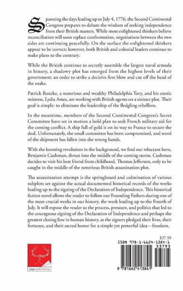 Spanning the days leading up to July 4, 1776, the Second Continental Congress prepares to debate the wisdom of seeking independence from their British masters. While most enlightened thinkers believe reconciliation will soon replace confrontation, negotiations between the two sides are continuing peacefully. On the surface the enlightened thinkers appear to be correct; however, both British and colonial leaders continue to make plans to the contrary. While the British continue to secretly assemble the largest naval armada in history, a shadowy plot has emerged from the highest levels of their government: an order to strike a decisive first blow and cut off the head of the snake. Patrick Rourke, a notorious and wealthy Philadelphia Tory, and his exotic mistress, Lydia Ames, are working with British agents on a sinister plot. Their goal is simple: to eliminate the leadership of the fledgling rebellion. In the meantime, members of the Second Continental Congress's Secret Committee have set in motion a bold plan to seek French military aid for the coming conflict. A ship full of gold is on its way to France to secure the deal. Unfortunately, the small committee has been compromised, and word of the shipment has fallen into the wrong hands. With the looming revolution in the background, we find our reluctant hero, Benjamin Cushman, thrust into the middle of the coming storm. Cushman decides to visit his best friend from childhood, Thomas Jefferson, only to be caught in the middle of the notorious British assassination plot. The assassination attempt is the springboard and culmination of various subplots set against the actual documented historical records of the weeks leading up to the signing of the Declaration of Independence. This historical fiction novel allows the reader to follow our Founding Fathers during one of the most crucial weeks in our history, the week leading up to the Fourth of July. It will expose the reader to the process, pressure, and politics that led to the courageous signing of the Declaration of Independence and perhaps the greatest closing line in human history, as the signers pledged their lives, their fortunes, and their sacred honor for a simple yet powerful idea-freedom.