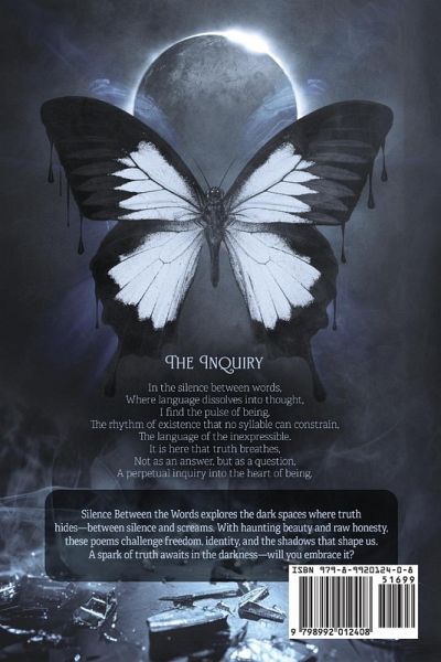 The Silence Between Words is a deeply introspective collection of poems that explores the spaces between thought and expression-where meaning is often unspoken, yet deeply felt. Through vivid imagery and raw emotion, the author delves into the universal struggles of self-discovery, inner conflict, and personal transformation. The poems reflect on themes of love, loss, fear, and redemption, capturing the delicate balance between light and darkness, strength and vulnerability. With a tone that is both tender and bold, this collection invites readers to listen beyond the words on the page, to the silences where growth, healing, and self-acceptance truly begin. Each poem becomes an exploration of embracing one's imperfections, unlearning societal conditioning, and finding the courage to speak one's truth-no matter how complex or messy it may be. The book calls for a pause in our busy lives, encouraging reflection on the moments that often go unnoticed, yet hold the potential for profound transformation. The Silence Between Words celebrates the quiet resilience within us all-the power to heal, evolve, and find meaning in life's most intimate and challenging experiences. It is a tribute to the strength that emerges when we allow ourselves to just be.