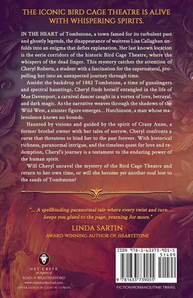 The iconic Bird Cage Theatre is alive with whispering spirits. In the heart of Tombstone, a town famed for its turbulent past and ghostly legends, the disappearance of waitress Lisa Callaghan unfolds into an enigma that defies explanation. Her last known location is the eerie corridors of the historic Bird Cage Theatre, where the whispers of the dead linger. This mystery catches the attention of Cheryl Roberts, a student with a fascination for the supernatural, propelling her into an unexpected journey through time. Amidst the backdrop of 1882 Tombstone, a time of gunslingers and spectral hauntings, Cheryl finds herself entangled in the life of Mae Davenport, a carnival dancer caught in a vortex of love, betrayal, and dark magic. As the narrative weaves through the shadows of the Wild West, a sinister figure emerges... Hutchinson, a man whose malevolence knows no bounds. Haunted by visions and guided by the spirit of Crazy Anne, a former brothel owner with her tales of sorrow, Cheryl confronts a curse that threatens to bind her to the past forever. With historical richness, paranormal intrigue, and the timeless quest for love and redemption, Cheryl's journey is a testament to the enduring power of the human spirit. Will Cheryl unravel the mystery of the Bird Cage Theatre and return to her own time, or will she become yet another soul lost to the sands of Tombstone?