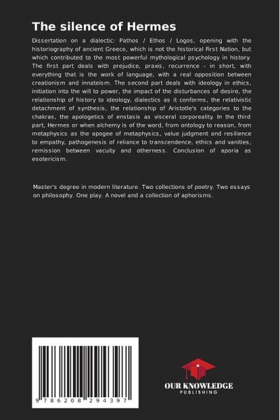 Dissertation on a dialectic: Pathos / Ethos / Logos, opening with the historiography of ancient Greece, which is not the historical First Nation, but which contributed to the most powerful mythological psychology in history. The first part deals with prejudice, praxis, recurrence - in short, with everything that is the work of language, with a real opposition between creationism and innateism. The second part deals with ideology in ethics, initiation into the will to power, the impact of the disturbances of desire, the relationship of history to ideology, dialectics as it conforms, the relativistic detachment of synthesis, the relationship of Aristotle's categories to the chakras, the apologetics of enstasis as visceral corporeality. In the third part, Hermes or when alchemy is of the word, from ontology to reason, from metaphysics as the apogee of metaphysics, value judgment and resilience to empathy, pathogenesis of reliance to transcendence, ethics and vanities, remission between vacuity and otherness. Conclusion of aporia as esotericism.