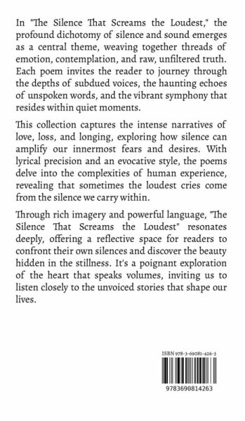 In "The Silence That Screams the Loudest," the profound dichotomy of silence and sound emerges as a central theme, weaving together threads of emotion, contemplation, and raw, unfiltered truth. Each poem invites the reader to journey through the depths of subdued voices, the haunting echoes of unspoken words, and the vibrant symphony that resides within quiet moments. This collection captures the intense narratives of love, loss, and longing, exploring how silence can amplify our innermost fears and desires. With lyrical precision and an evocative style, the poems delve into the complexities of human experience, revealing that sometimes the loudest cries come from the silence we carry within. Through rich imagery and powerful language, "The Silence That Screams the Loudest" resonates deeply, offering a reflective space for readers to confront their own silences and discover the beauty hidden in the stillness. It's a poignant exploration of the heart that speaks volumes, inviting us to listen closely to the unvoiced stories that shape our lives.