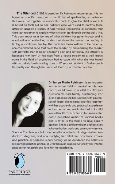 The Silenced Child is based on Dr Robinson's experiences. It is not based on specific cases but a compilation of spellbinding experiences that were put together to create this book to give the child a voice. It is based on facts but no one patient's case were used to portray these attention-grabbing stories. It was various fascinating experiences that were put together to explain what children go through during daily life. This book reads as a journey of what children has gone through and is a collection of enthralling stories that shows the trauma our society is letting our children live by. The book has been written to be an easy, non-complicated read that holds the reader by mesmerizing the reader with powerful stories about children's pain and suffering. The intensity is balanced with how Dr Robinson from a young student to a well-known name in the field of psychology had to cope with what she was faced with on a daily basis starting of as a 17 year old student at Stellenbosch University and through her years of therapy in private practice.