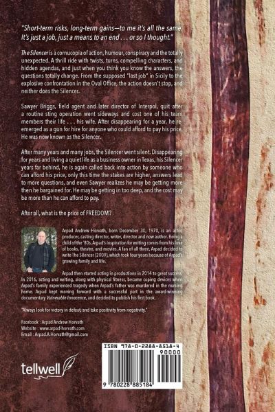 "Short-term risks, long-term gains-to me it's all the same. It's just a job, just a means to an end . . . or so I thought." The Silencer is a cornucopia of action, humour, conspiracy and the totally unexpected. A thrill ride with twists, turns, compelling characters, and hidden agendas, and just when you think you know the answers, the questions totally change. From the supposed "last job" in Sicily to the explosive confrontation in the Oval Office, the action doesn't stop, and neither does the Silencer. Sawyer Briggs, field agent and later director of Interpol, quit after a routine sting operation went sideways and cost one of his team members their life . . . his wife. After disappearing for a year, he reemerged as a gun for hire for anyone who could afford to pay his price. He was now known as the Silencer. After many years and many jobs, the Silencer went silent. Disappearing for years and living a quiet life as a business owner in Texas, his Silencer years far behind, he is again called back into action by someone who can afford his price, only this time the stakes are higher, answers lead to more questions, and even Sawyer realizes he may be getting more then he bargained for. He may be getting in too deep, and the cost may be more than he can afford to pay. After all, what is the price of FREEDOM?