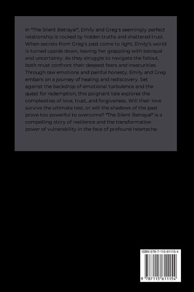 In *The Silent Betrayal*, Emily and Greg's seemingly perfect relationship is rocked by hidden truths and shattered trust. When secrets from Greg's past come to light, Emily's world is turned upside down, leaving her grappling with betrayal and uncertainty. As they struggle to navigate the fallout, both must confront their deepest fears and insecurities. Through raw emotions and painful honesty, Emily and Greg embark on a journey of healing and rediscovery. Set against the backdrop of emotional turbulence and the quest for redemption, this poignant tale explores the complexities of love, trust, and forgiveness. Will their love survive the ultimate test, or will the shadows of the past prove too powerful to overcome? *The Silent Betrayal* is a compelling story of resilience and the transformative power of vulnerability in the face of profound heartache.
