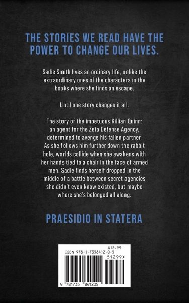 The stories we read have the power to change our lives. Sadie Smith lives an ordinary life, unlike the extraordinary ones of the characters in the books where she finds an escape. Until one story changes it all. The story of the impetuous Killian Quinn: an agent for the Zeta Defense Agency, determined to avenge his fallen partner. As she follows him further down the rabbit hole, worlds collide when she awakens with her hands tied to a chair in the face of armed men. Sadie finds herself dropped in the middle of a battle between secret agencies she didn't even know existed, but maybe where she's belonged all along.