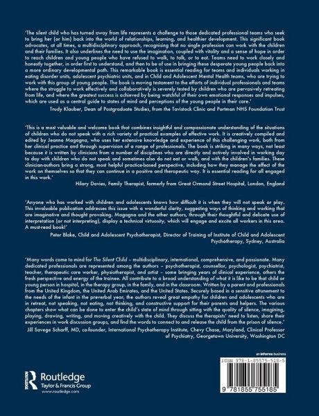 Introduction -- Introduction -- "The sound of silence" -- "Milo was a normal boy" -- Communicating without words -- Young Children -- The musings of babies: reflective thinking, emotion, and the re-integration of the good object -- A baby's "broken bridge" to the parents -- Evolving patterns of parental containment of a young child communicating through not eating or speaking -- The child who has not yet found words -- Young People -- Extended family explorations using dreams, drawings, and play when the referred child does not speak -- Inpatient care of a child who does not walk, talk, or eat -- Collaborating, containing, and inspiring confidence: physiotherapy with a child who does not talk, walk, or eat -- The silent child in school: teaching a child who does not talk, walk, or eat -- "Compelled to die": psychotherapy with a girl who does not talk, walk, or eat -- Countertransference in the psychoanalysis of a silent adolescent boy -- A journey through family therapy with a non-speaking child -- Opaque silence in groups -- Creative Activities for Non-Speaking Children -- The creative group experience -- Roar and rumpus: engaging non-speaking children through stories and songs