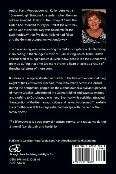 Author Hans Moederzoon van Kuilenburg was a 10-year-old girl living in Amsterdam when German soldiers invaded Holland in the spring of 1940. The Dutch had intended to stay neutral at the outbreak of the war, as their military was no match for the Nazi hordes. Within five days, Holland had fallen and the German occupation was underway. The five ensuing years were among the darkest chapters in Dutch history, culminating in the "hunger winter" of 1944, during which 30,000 Dutch citizens died of hunger and cold. Even today, people like the author, who grew up during that time, are more prone to heart attacks as a result of the physical stress of those years. But despite having capitulated so quickly in the face of the overwhelming might of the German war machine, there were many heroes in Holland during the occupation; people like the author's father, a civilian supervisor of marine supplies, who robbed the Germans blind and gave stolen food and clothing to Dutch people in need. Eventually his activities attracted the attention of the German authorities and he was imprisoned. Thankfully Hans' mother was able to stage a dramatic escape with the help of the family doctor. The Silent Heroes is a true story of heroism, survival and resistance during a time of fear, despair, and hardship. Hans Moederzoon van Kuilenburg was born in Amsterdam and immigrated to the U.S. in 1959. She had a distinguished career as a medical assistant before retiring. In addition to writing, she also does photography and sometimes exhibits her work. The Silent Heroes is her first book. Publisher's website: http://sbpra.com/HansMoederzoonVanKuilenburg