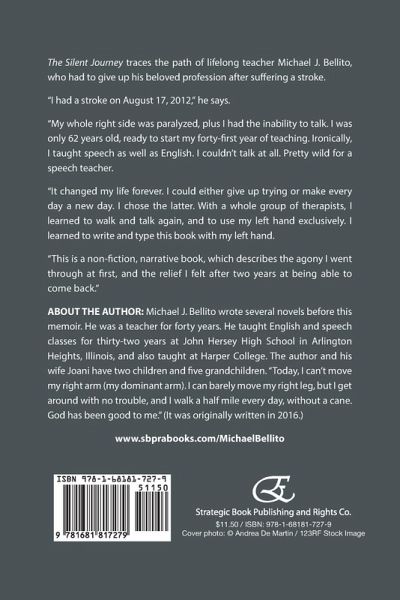 The Silent Journey traces the path of lifelong teacher Michael J. Bellito, who had to give up his beloved profession after suffering a stroke. "I had a stroke on August 17, 2012," he says. "My whole right side was paralyzed, plus I had the inability to talk. I was only 62 years old, ready to start my forty-first year of teaching. Ironically, I taught speech as well as English. I couldn't talk at all. Pretty wild for a speech teacher. "It changed my life forever. I could either give up trying or make every day a new day. I chose the latter. With a whole group of therapists, I learned to walk and talk again, and to use my left hand exclusively. I learned to write and type this book with my left hand. "This is a non-fiction, narrative book, which describes the agony I went through at first, and the relief I felt after two years at being able to come back." About the Author: Michael J. Bellito wrote several novels before this memoir. He was a teacher for forty years. He taught English and speech classes for thirty-two years at John Hersey High School in Arlington Heights, Illinois, and also taught at Harper College. The author and his wife Joani have two children and five grandchildren. "Today, I can't move my right arm (my dominant arm). I can barely move my right leg, but I get around with no trouble, and I walk a half mile every day, without a cane. God has been good to me." (It was originally written in 2016.)