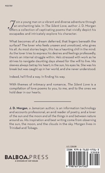 Embark on an enchanting escapade with a young man who journeys through a lively, diverse yellow brick road reminiscent of Dorothy's iconic tale. In The Silent Love, author J. D. Morgan offers a collection of captivating poems that vividly depict his adventures and intricately explore his character. What becomes of a dream deferred, that lingers beneath the surface? The lover who feels unseen and unnoticed, who gives his all. As most stories begin, this has a haunting chill in the mind. As the lover tries to express his desires and feelings professedly, there's an internal struggle within. He's stressed with work as he strives to navigate daunting days ahead for the will to live. His sleeves always betray his heart; in the sun, his eyes lie. She was his break but was caught up in her world, and she never understood. Indeed, he'll find a way. In finding his way. With themes of intimacy and romance, The Silent Love is a compilation of love poems to you, to me, and to the ones we hold dear in our hearts.