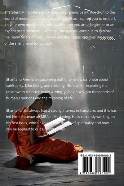 The Silent Mind: Discovering the Power of Meditation is a comprehensive guide to the ancient practice of meditation and how it can be integrated into modern life. Written by author Shantanu Aher, the book delves into the history and science of meditation, providing readers with a deep understanding of its benefits and how it can be used to improve physical and mental well-being. This book is designed to demystify meditation and make it accessible to anyone, regardless of experience level. It covers the basics of meditation and provides practical tips and techniques to help readers incorporate it into their daily routine. The author also shares his own personal journey and the lessons he has learned along the way. In addition to providing valuable guidance for meditation practice, the book also explores the spiritual and philosophical aspects of meditation, and how it can be used for self-discovery and personal growth. The author's passion for the subject shines through on every page, making this book a must-read for anyone looking to improve their physical and mental well-being and to discover the true power of meditation.