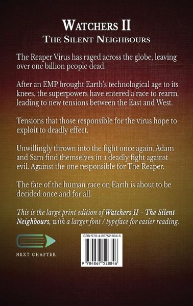 The Reaper Virus has raged across the globe, leaving over one billion people dead. After an EMP brought Earth's technological age to its knees, the superpowers have entered a race to rearm, leading to new tensions between the East and West. Tensions that those responsible for the virus hope to exploit to deadly effect. Unwillingly thrown into the fight once again, Adam and Sam find themselves in a deadly fight against evil. Against the one responsible for The Reaper. The fate of the human race on Earth is about to be decided once and for all. This is the large print edition of Watchers II - The Silent Neighbours, with a larger font / typeface for easier reading.