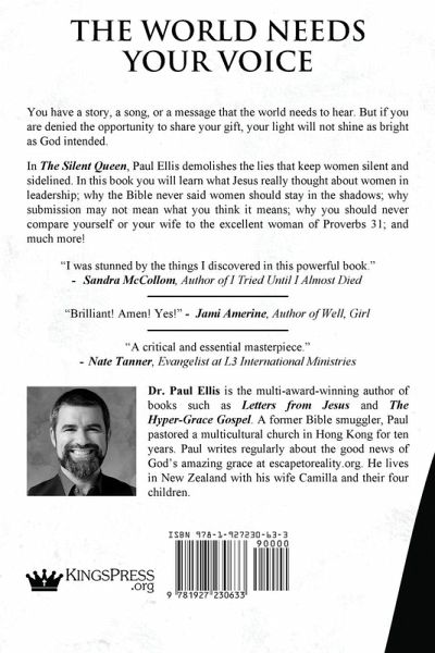 You have a story, a song, or a message that the world needs to hear. But if you are denied the opportunity to share your gift, your light will not shine as bright as God intended. In The Silent Queen, Paul Ellis tackles the tough questions that keep women silent and sidelined. - Should women stay silent in church? - Can women teach, preach and pastor? - What did Jesus think about women in leadership? - Is infidelity the only excuse for divorce? - Should women submit to male leaders? - Are wives really helpmates? - Are women more easily deceived? - And much more! "I was stunned by the things I discovered in this powerful book." - Sandra McCollom, author of I Tried Until I Almost Died "Brilliant! Amen! Yes!" ~ Jami Amerine, author of Well, Girl "A critical and essential masterpiece." ~ Nate Tanner, evangelist at L3 International Ministries