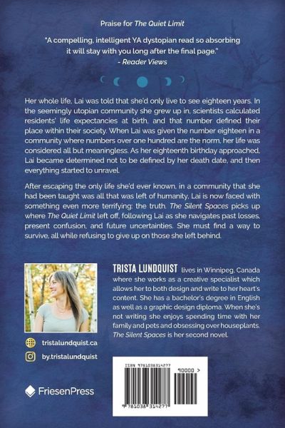 Her whole life, Lai was told that she'd only live to see eighteen years. In the seemingly utopian community she grew up in, scientists calculated residents' life expectancies at birth, and that number defined their place within their society. When Lai was given the number eighteen in a community where numbers over one hundred are the norm, her life was considered all but meaningless. As her eighteenth birthday approached, Lai became determined not to be defined by her death date, and then everything started to unravel. After escaping the only life she'd ever known, in a community that she had been taught was all that was left of humanity, Lai is now faced with something even more terrifying: the truth. The Silent Spaces picks up where The Quiet Limit left off, following Lai as she navigates past losses, present confusion, and future uncertainties. She must find a way to survive, all while refusing to give up on those she left behind.