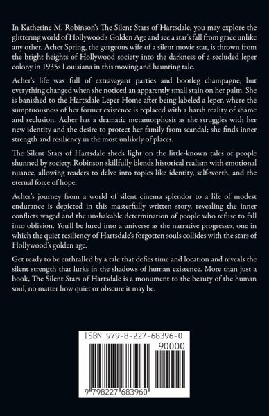 In Katherine M. Robinson's The Silent Stars of Hartsdale, you may explore the glittering world of Hollywood's Golden Age and see a star's fall from grace unlike any other. Acher Spring, the gorgeous wife of a silent movie star, is thrown from the bright heights of Hollywood society into the darkness of a secluded leper colony in 1935s Louisiana in this moving and haunting tale. Acher's life was full of extravagant parties and bootleg champagne, but everything changed when she noticed an apparently small stain on her palm. She is banished to the Hartsdale Leper Home after being labeled a leper, where the sumptuousness of her former existence is replaced with a harsh reality of shame and seclusion. Acher has a dramatic metamorphosis as she struggles with her new identity and the desire to protect her family from scandal; she finds inner strength and resiliency in the most unlikely of places. The Silent Stars of Hartsdale sheds light on the little-known tales of people shunned by society. Robinson skillfully blends historical realism with emotional nuance, allowing readers to delve into topics like identity, self-worth, and the eternal force of hope. Acher's journey from a world of silent cinema splendor to a life of modest endurance is depicted in this masterfully written story, revealing the inner conflicts waged and the unshakable determination of people who refuse to fall into oblivion. You'll be lured into a universe as the narrative progresses, one in which the quiet resiliency of Hartsdale's forgotten souls collides with the stars of Hollywood's golden age. Get ready to be enthralled by a tale that defies time and location and reveals the silent strength that lurks in the shadows of human existence. More than just a book, The Silent Stars of Hartsdale is a monument to the beauty of the human soul, no matter how quiet or obscure it may be.